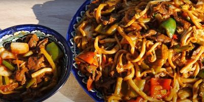 Отдельно сварите лагманную лапшу в подсоленной воде по инструкции (5–7 минут). Если делаете сами: замесите тесто из муки, яйца, воды и соли, раскатайте тонко, нарежьте полосками и отварите. - Сборка блюда.