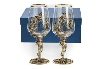 Изящный набор из двух бокалов, эффектно представленных на синем ложементе из атласа в дизайнерской коробке – лучший подарок для ценителя прекрасных вещей и любителя вин.