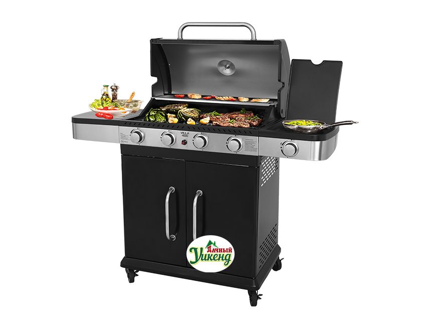 С газовым грилем VILLA 400 Black готовить приятно в любое время года! Летом он нагревается до рабочей температуры за 5 минут, а зимой при -10 ̊С за 10 минут. Быстрому набору температуры способствуют 4 горелки суммарной мощностью 12 кВт и отражающий экран в крышке гриля, который снижает теплопотери.