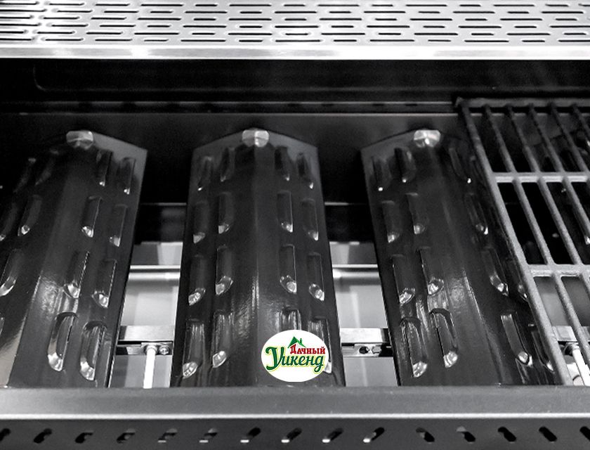 У газового гриля VILLA 400 Silver на борту 4 основные горелки, оснащенные V-образными рассекателями пламени. Рассекатели обеспечивают равномерное слоистое нагревание, а капающие на них капли маринада или сока испаряются под воздействием высокой температуры и поднимаются вверх, делая вкус ваших блюд более интенсивным.