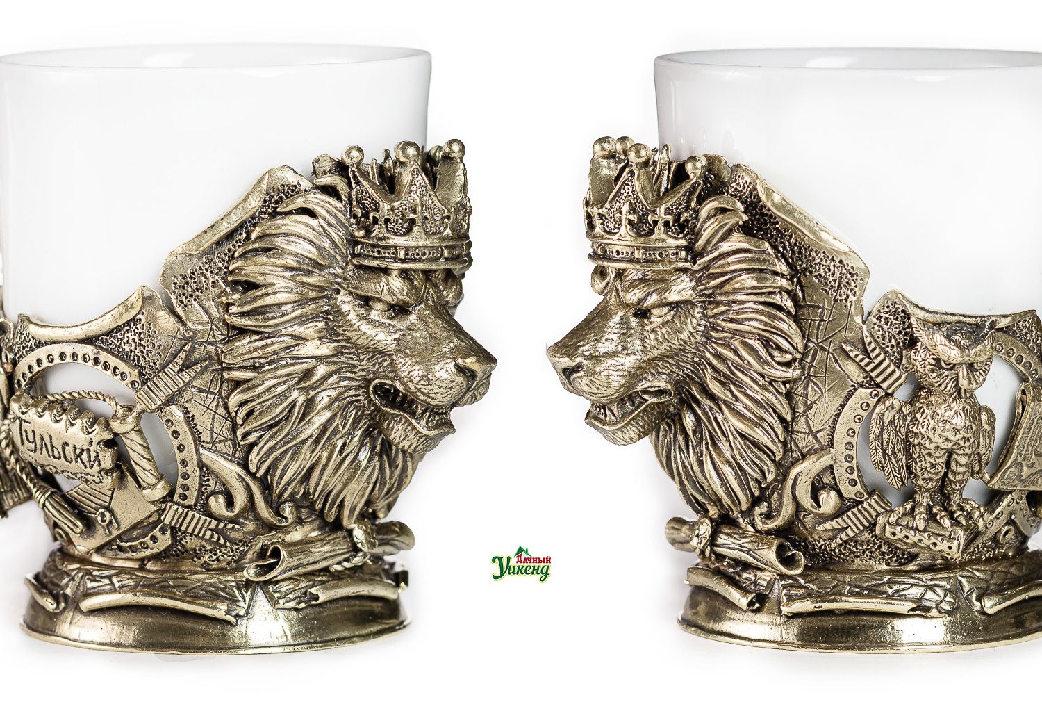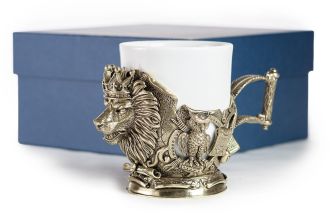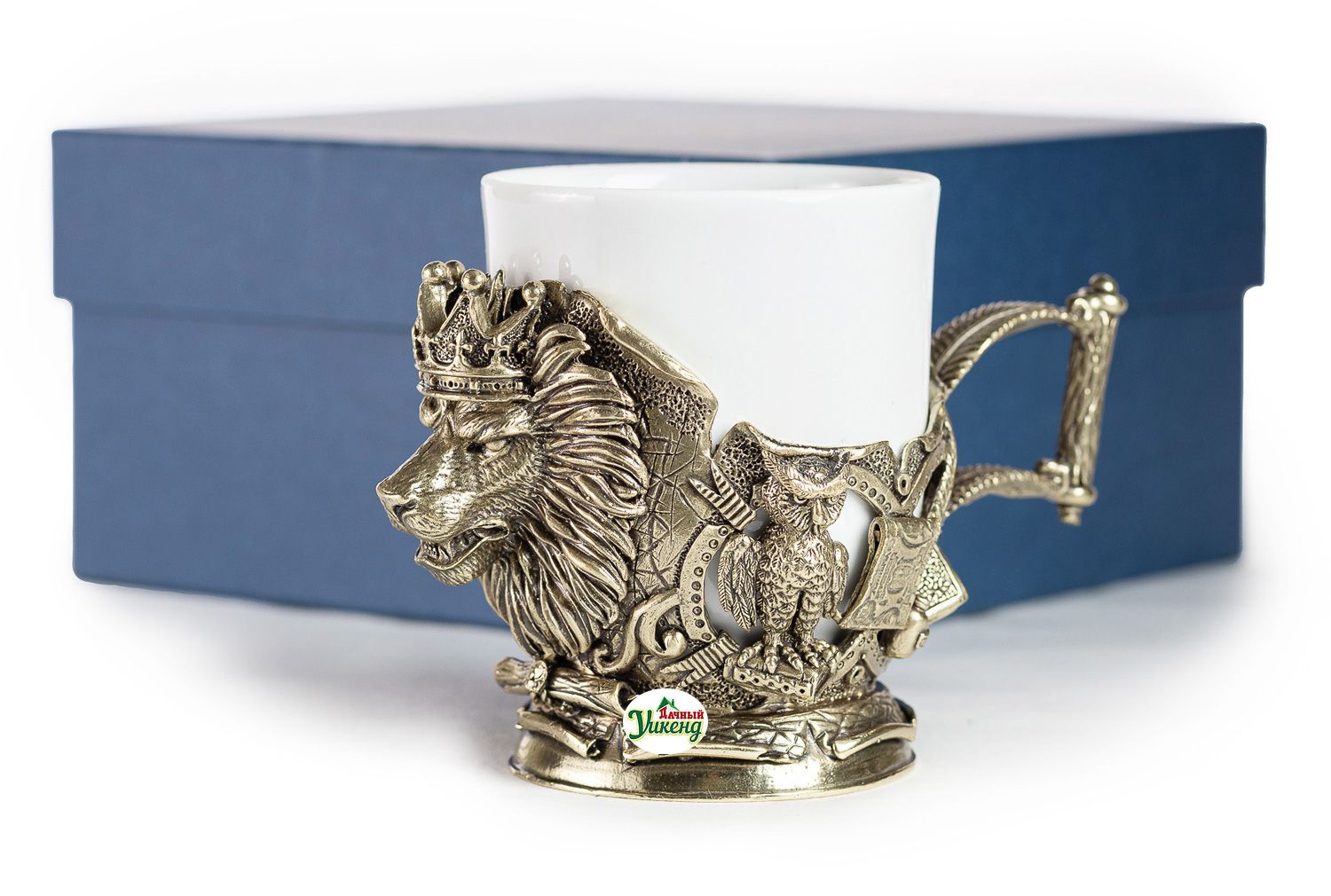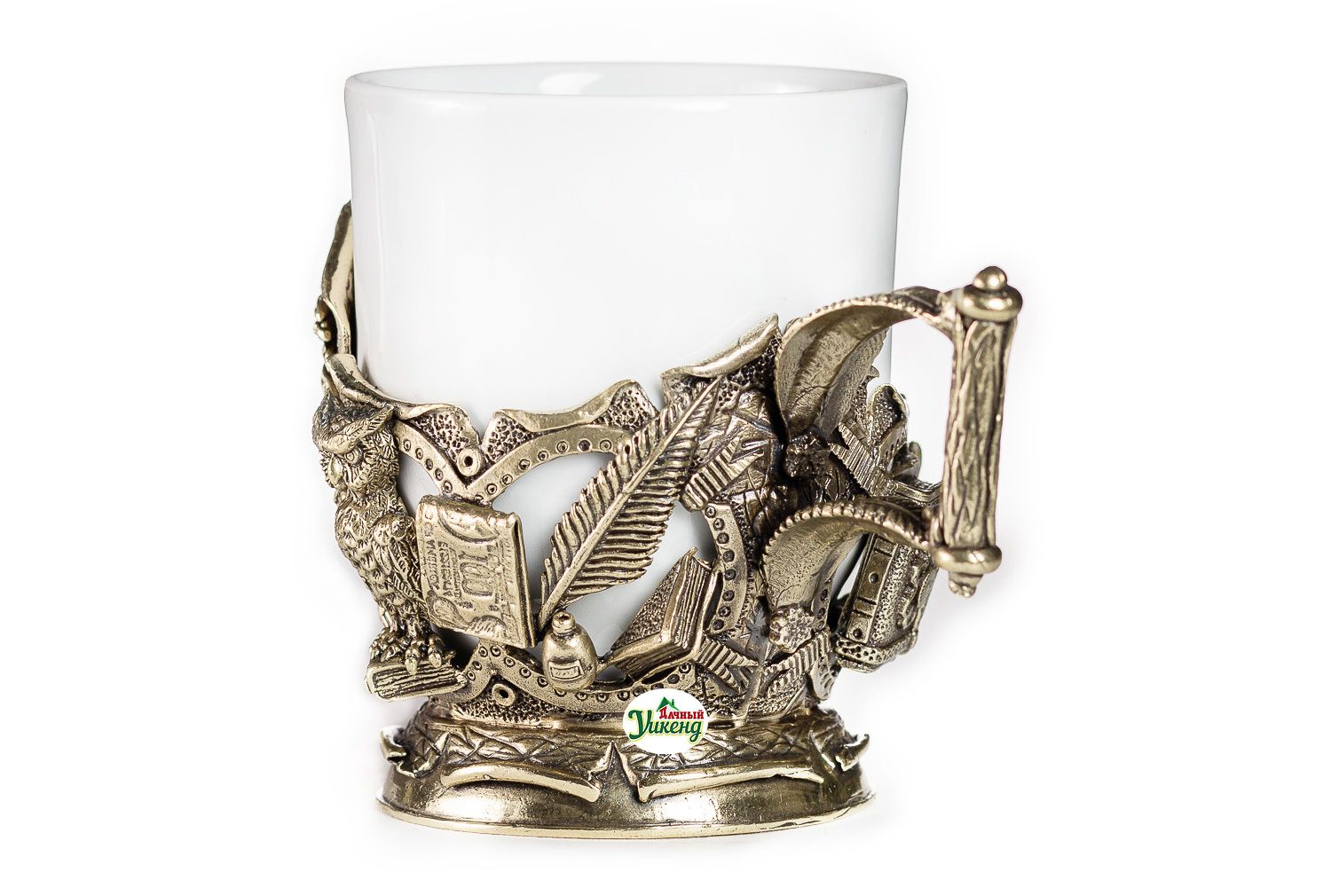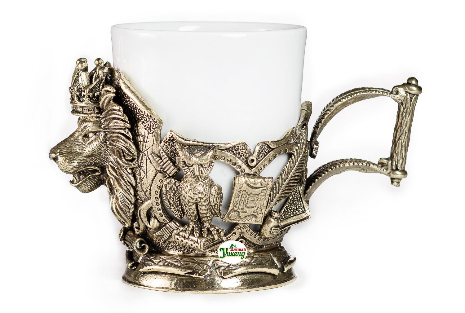 На латунном подстаканнике кофейной чашки «Мудрому руководителю есть все атрибуты, намекающие на ум, деловитость, канцеляризм начальника – голова льва с корой на голове олицетворяет власть, филин – мудрость, книга, конверт с печатью, свиток напоминают об умении вести деловую документацию.