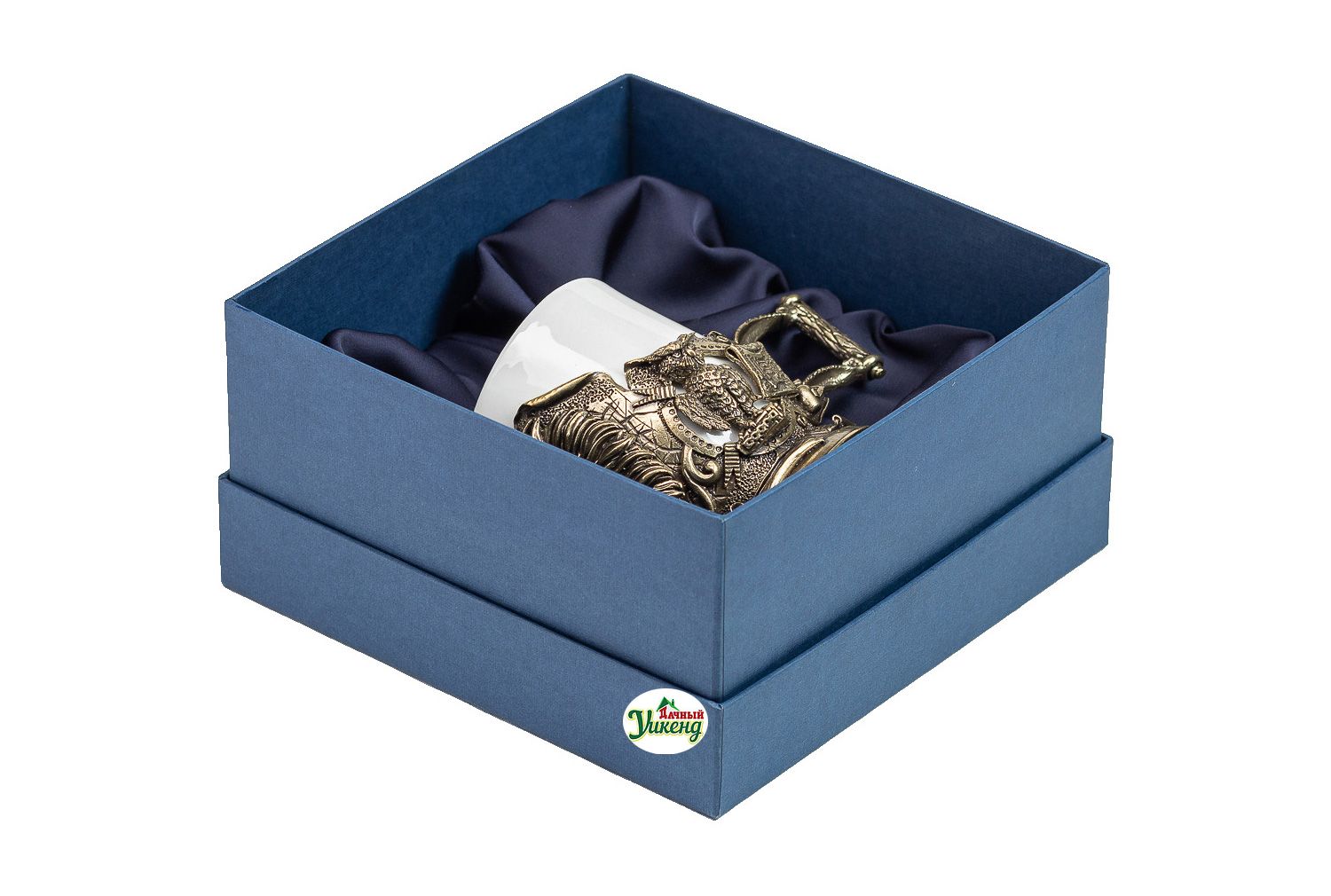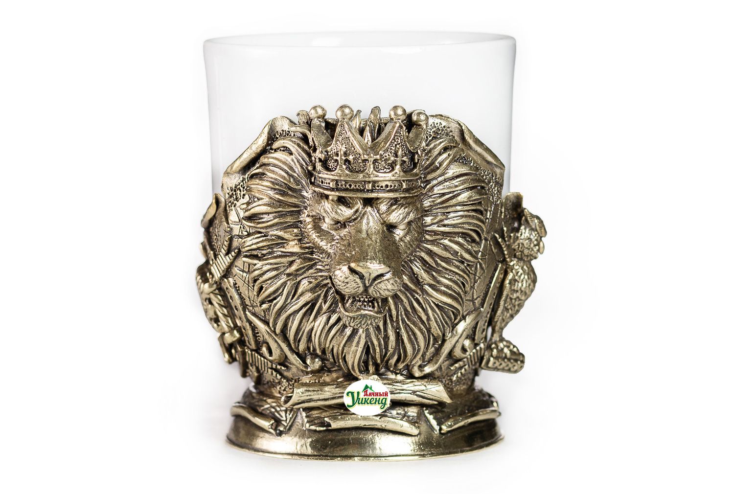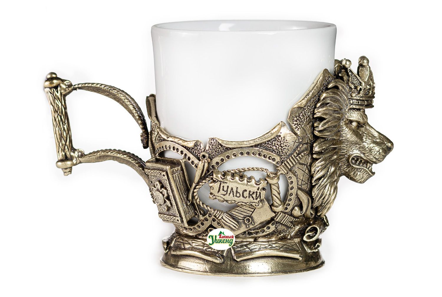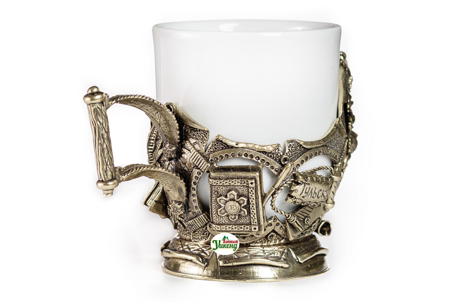 На латунном подстаканнике кофейной чашки «Мудрому руководителю есть все атрибуты, намекающие на ум, деловитость, канцеляризм начальника – голова льва с корой на голове олицетворяет власть, филин – мудрость, книга, конверт с печатью, свиток напоминают об умении вести деловую документацию.