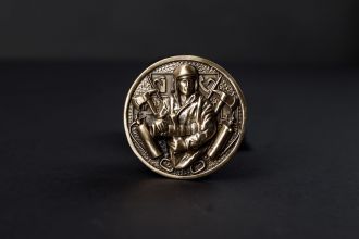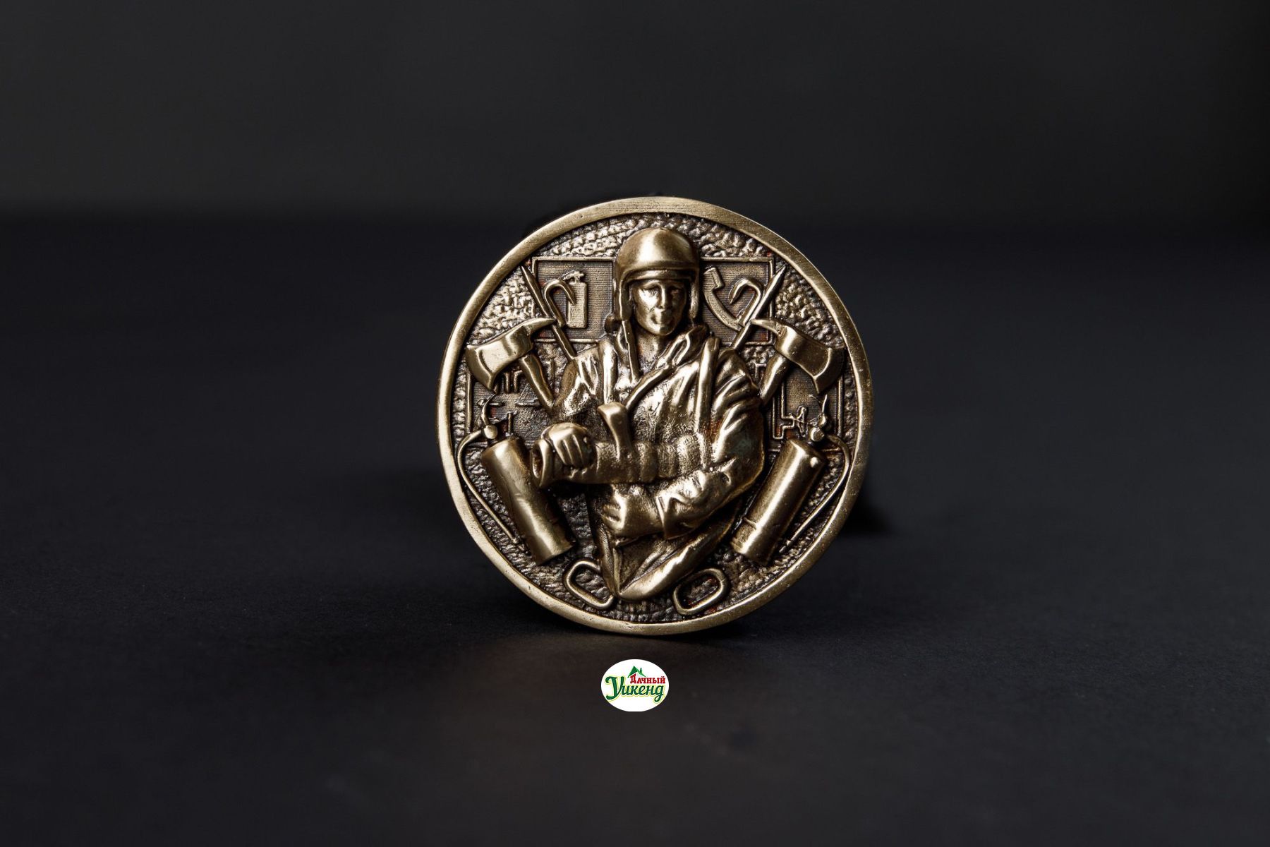 Магнит из бронзы, выполненный методом художественного литья, украшен рельефным изображением пожарника с брандспойтом в руке. Ручная работа передает мельчайшие подробности композиции – волевые черты лица, каску, костюм, топоры, огнетушители.
