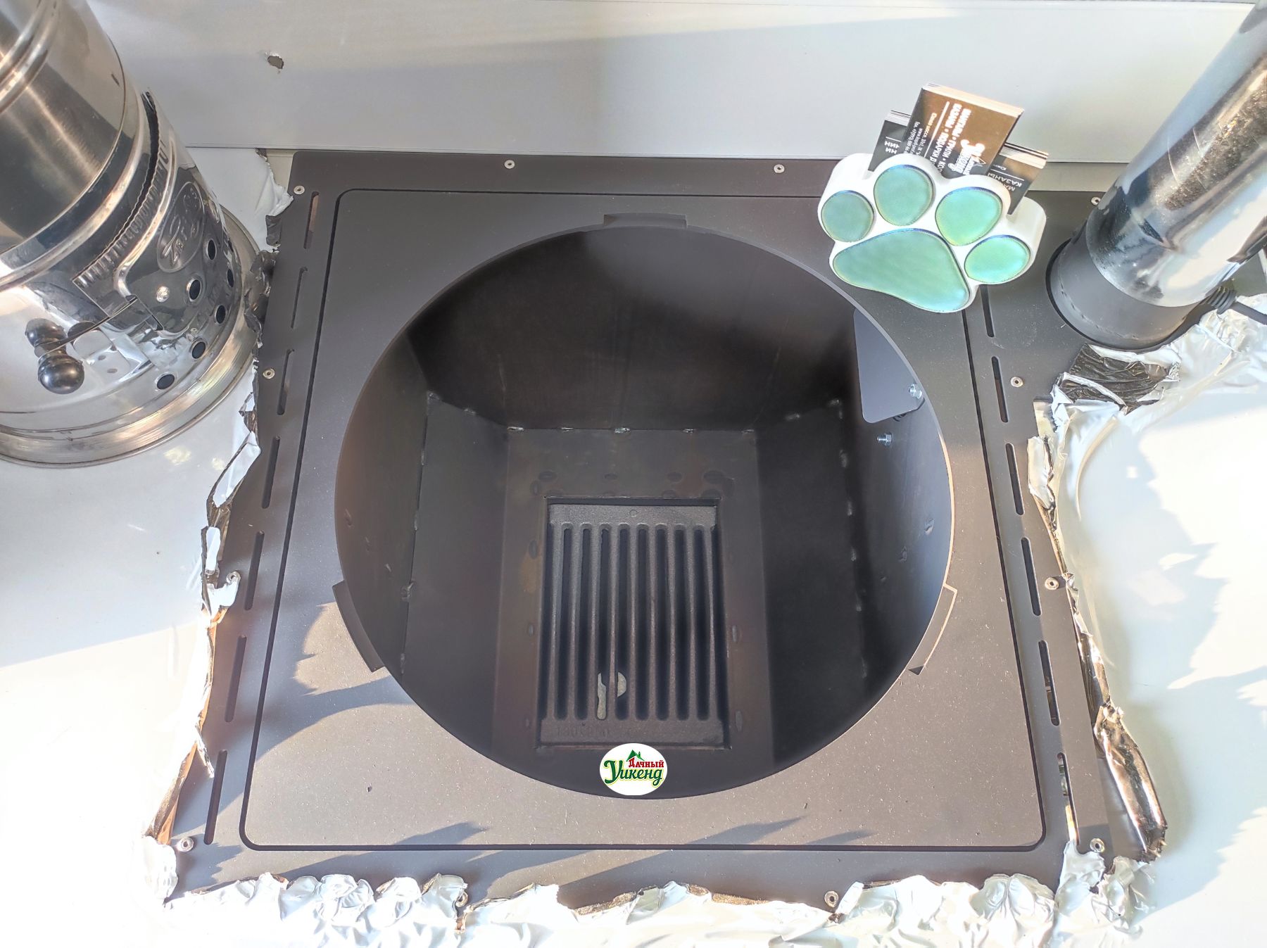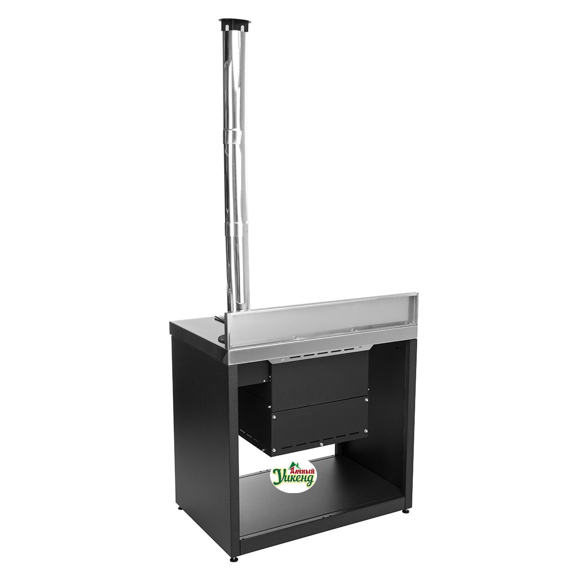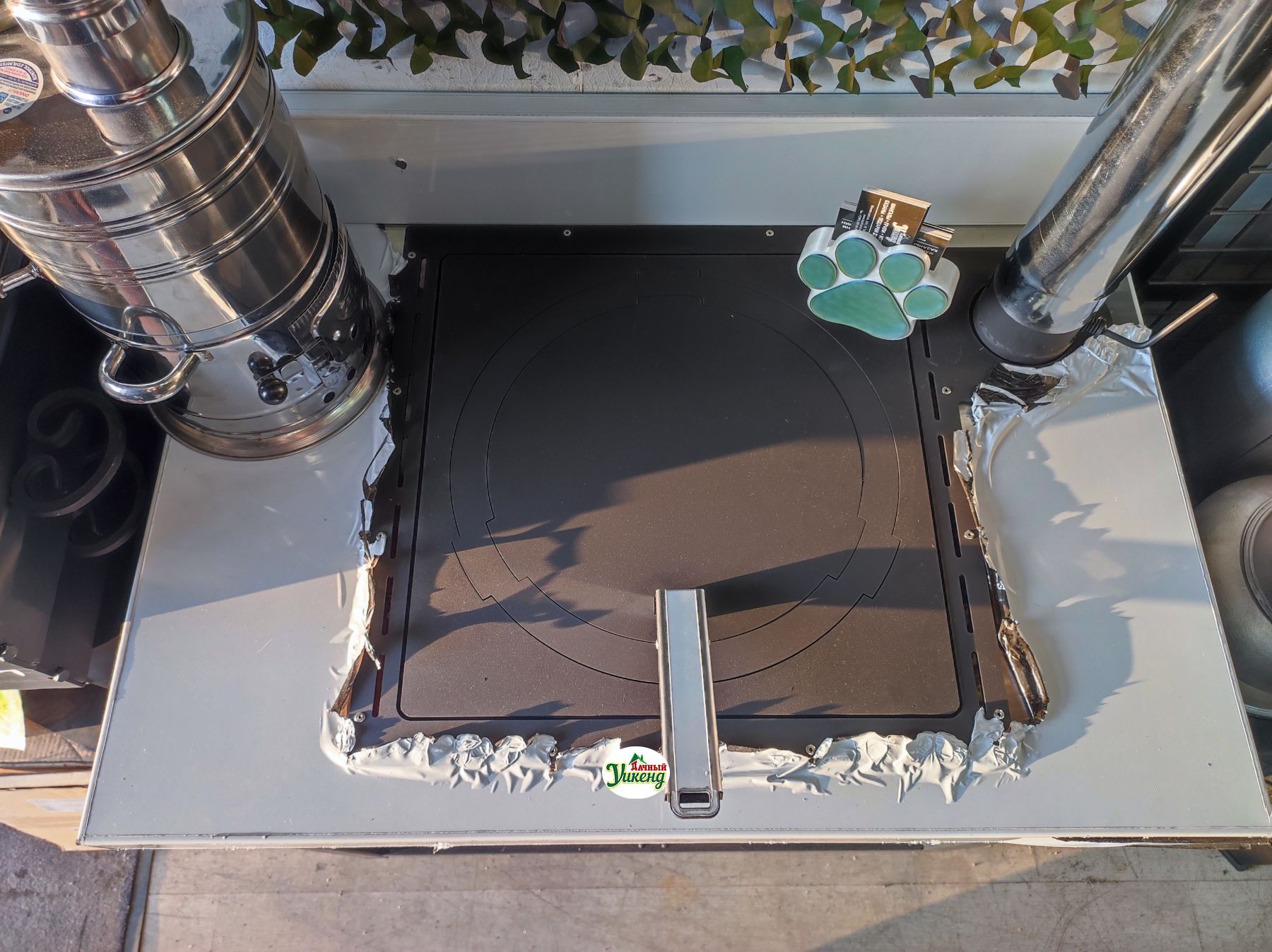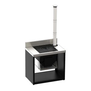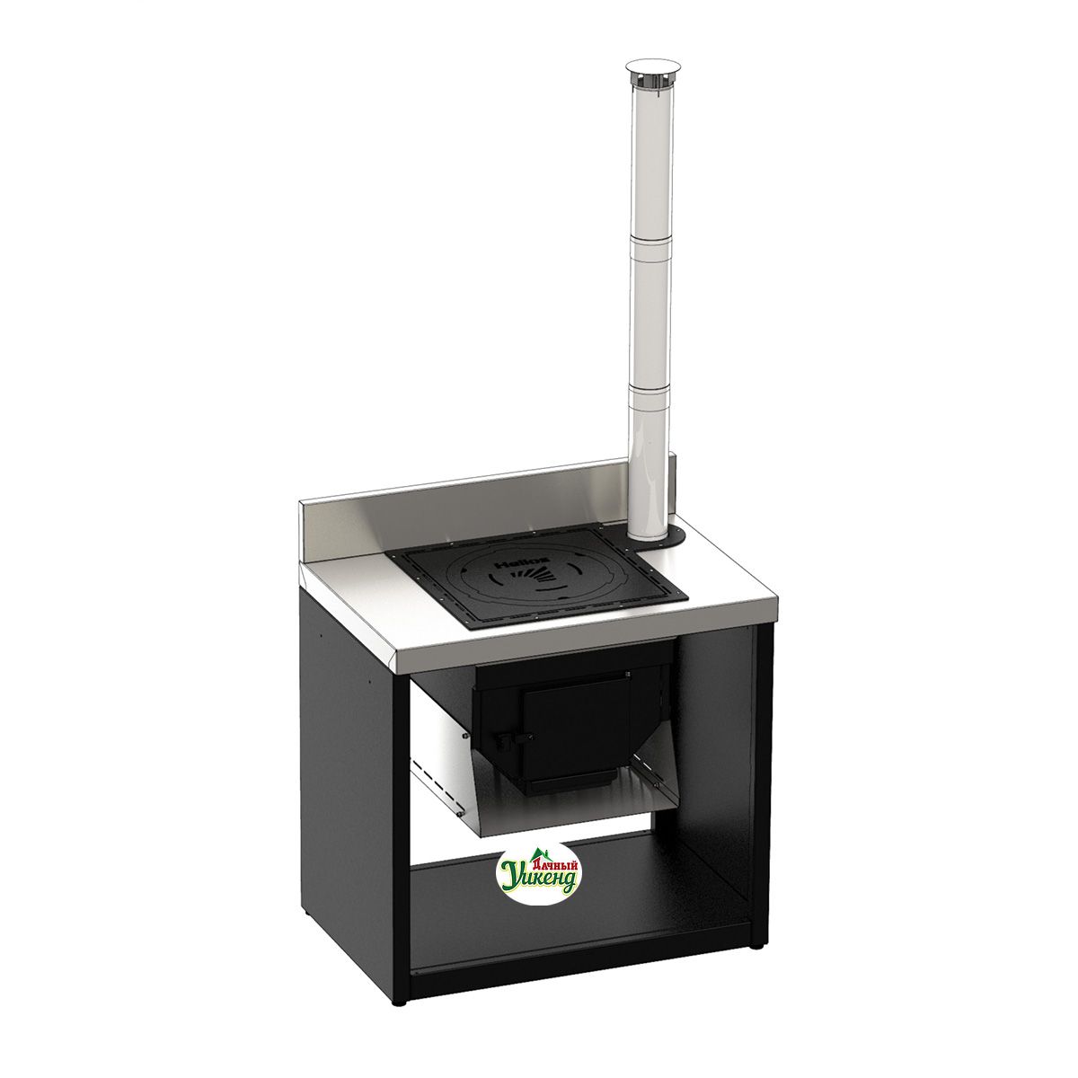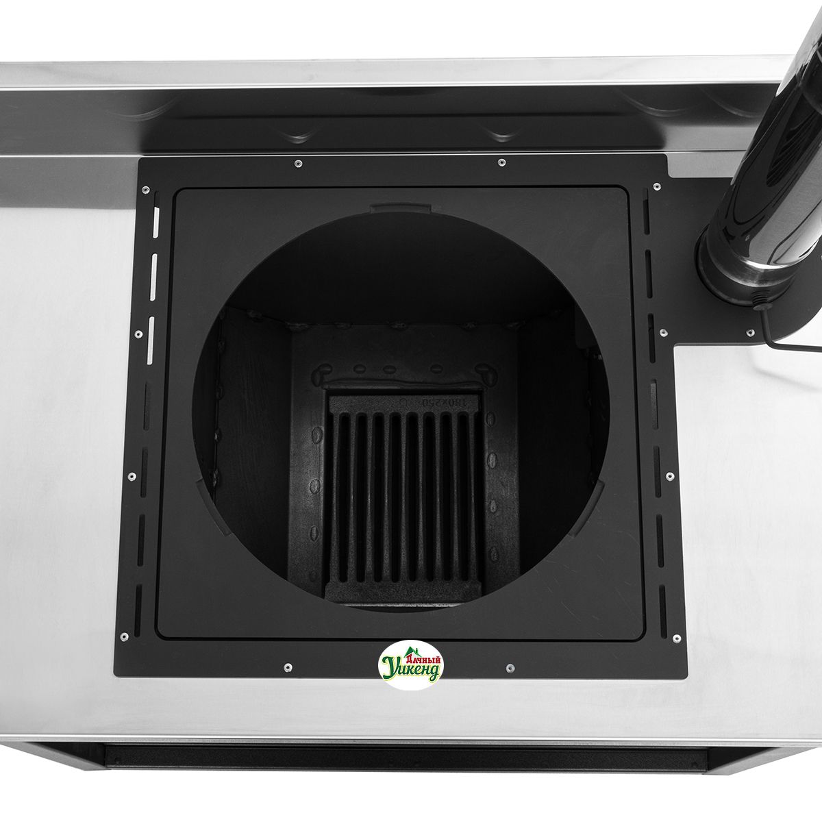 Печь выполнена из стали толщиной 2 мм (корпус) и 5 мм (крыша корпуса, кольцо, конфорка) и имеет специальный защитный экран для снижения нагрева каркаса модуля. Все элементы печи окрашены специальной термостойкой краской. Различный диаметр конфорок - 330 мм и 394 мм - позволяет устанавливать разные по объему емкости для разогрева и приготовления пищи (казаны объемом 6-12 литров). Дверца топки печи запирается с помощью компактной и практичной ручки. Горение регулируется с помощью подачи воздуха регулятором тяги дымохода и при выдвижении зольного ящика, исполняющего роль поддувала. Высота модуля регулируется с помощью специальных ножек.