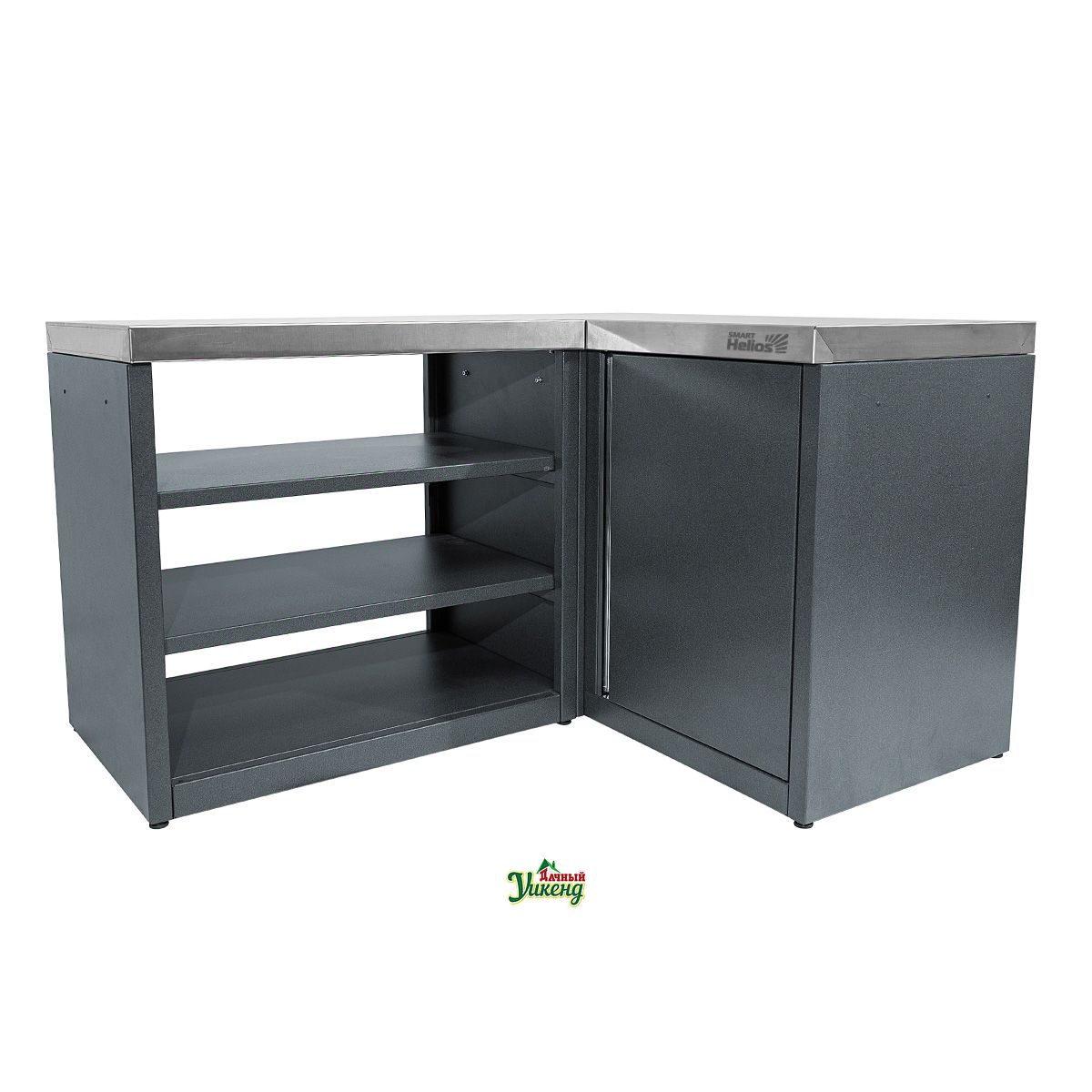 Шкаф угловой универсальный представляет собой полноценное рабочее пространство, на котором можно нарезать продукты или разложить кухонные принадлежности. Широкая столешница изготовлена из пищевой нержавеющей стали, обеспечивающей долговечность и легкость в уходе. Каркас модуля выполнен из высококачественной стали с прочным полимерным покрытием. Модуль имеет две дополнительные полки внутри каркаса с тремя положениями высоты, что позволяет организовать хранение всех необходимых кухонных принадлежностей наиболее удобным образом Шкаф имеет систему креплений с боковой стенкой приставного модуля, позволяя образовывать угол с любым модулем из серии HELIOS SMART. Система может устанавливаться с правой и с левой стороны, в зависимости от нужного угла.