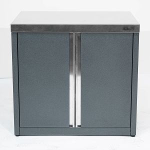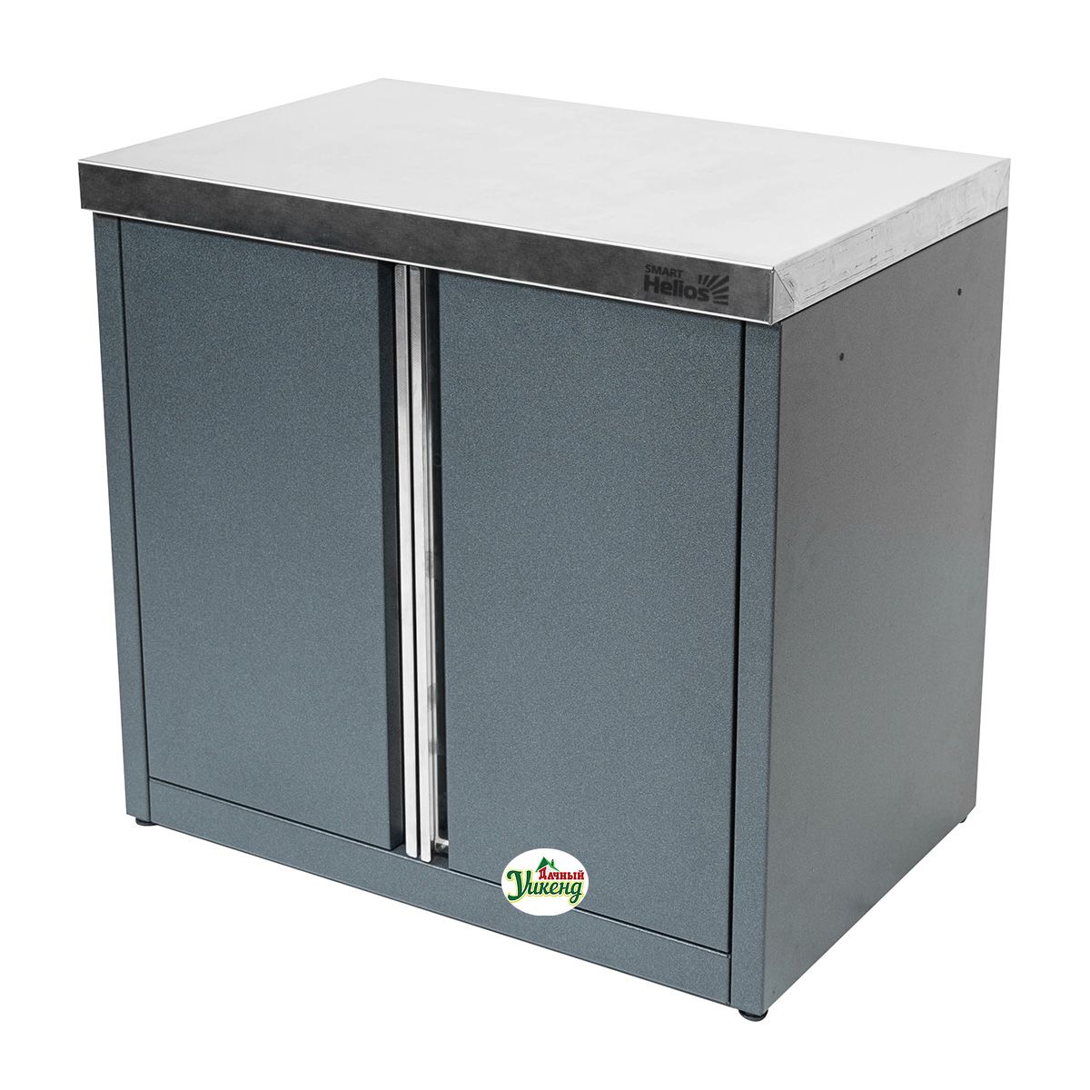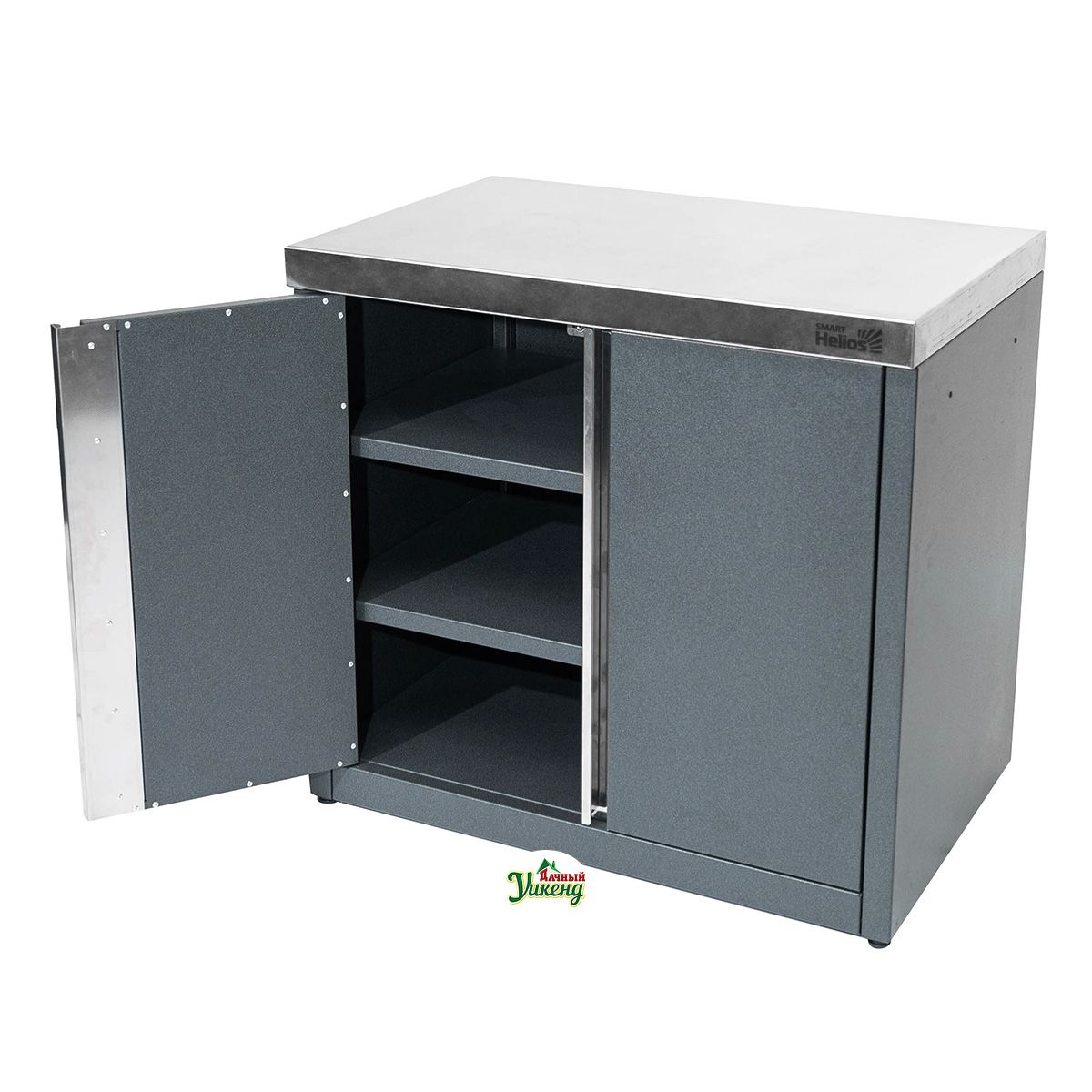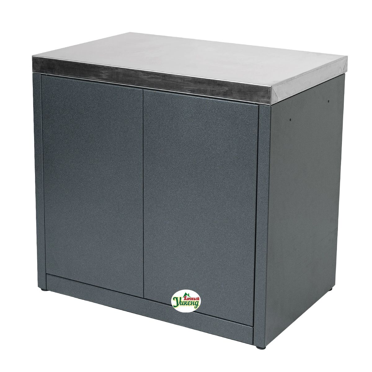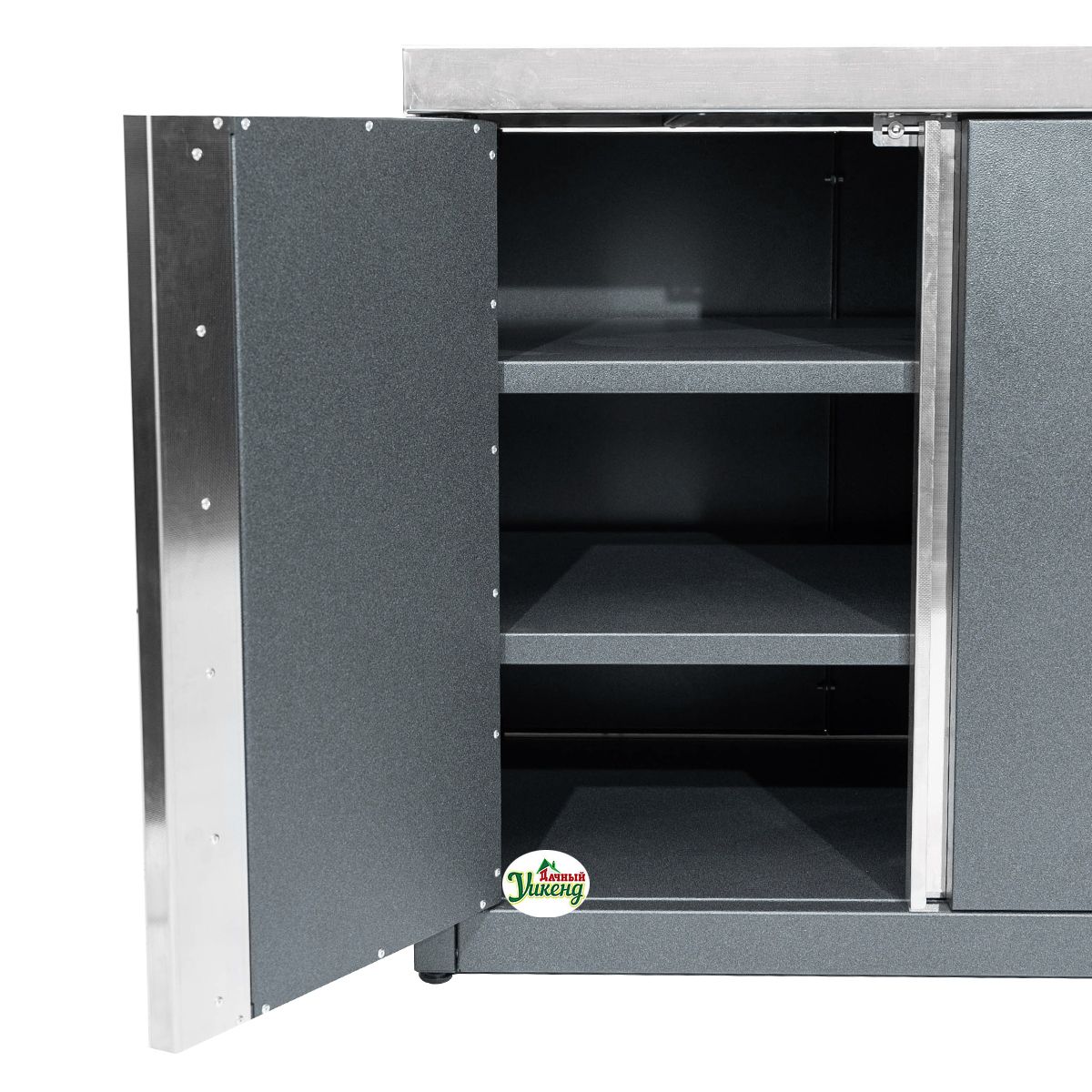 Шкаф представляет собой полноценное рабочее пространство, на котором можно нарезать продукты или разложить кухонные принадлежности. Широкая столешница изготовлена из пищевой нержавеющей стали, обеспечивающей долговечность и легкость в уходе. Каркас модуля выполнен из высококачественной стали с прочным полимерным покрытием. Шкаф имеет две дополнительные полки внутри каркаса с тремя положениями высоты, что позволяет организовать хранение всех необходимых кухонных принадлежностей наиболее удобным образом. Модуль закрывается двумя дверками на магнитных фиксаторах. Ручки дверок модуля выполнены из текстурированной нержавеющей стали. Высота модуля регулируется с помощью специальных ножек.