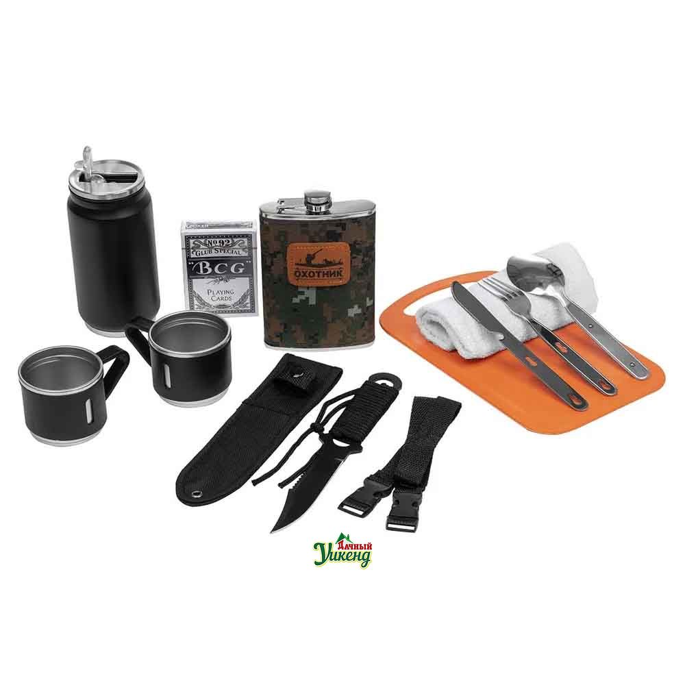 Комплектация набора:фляжка 270 мл 1шт - полотенце 1шт - вилка, ложка, нож складные - термос 1шт - кружка 2шт - нож 1шт - игральные карты 1шт - разделочная доска 1шт