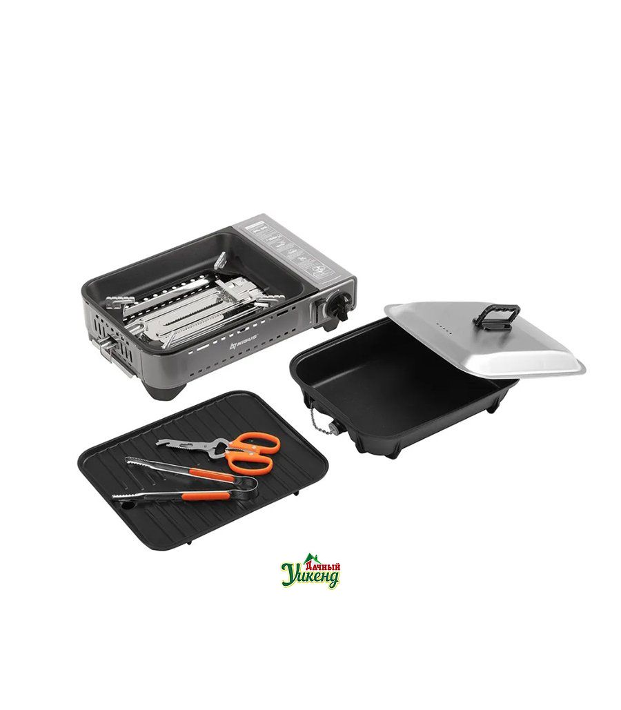 Комплектация:Плита газовая - 3-х слойная пластина для гриля (алюминиевое литье) с антипригарным покрытием (гриль) – 1шт - 3-х слойная сковорода-гриль с антипригарным покрытием (алюминиевое литье) и крышка из нержавеющей стали для сковороды-гриль - Съемный поддон для сбора капель – 1шт - Кухонные щипцы (нержавеющая сталь 403 и ручка из полипропилена) – 1шт - Многофункциональные ножницы – 1шт