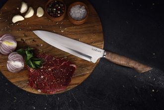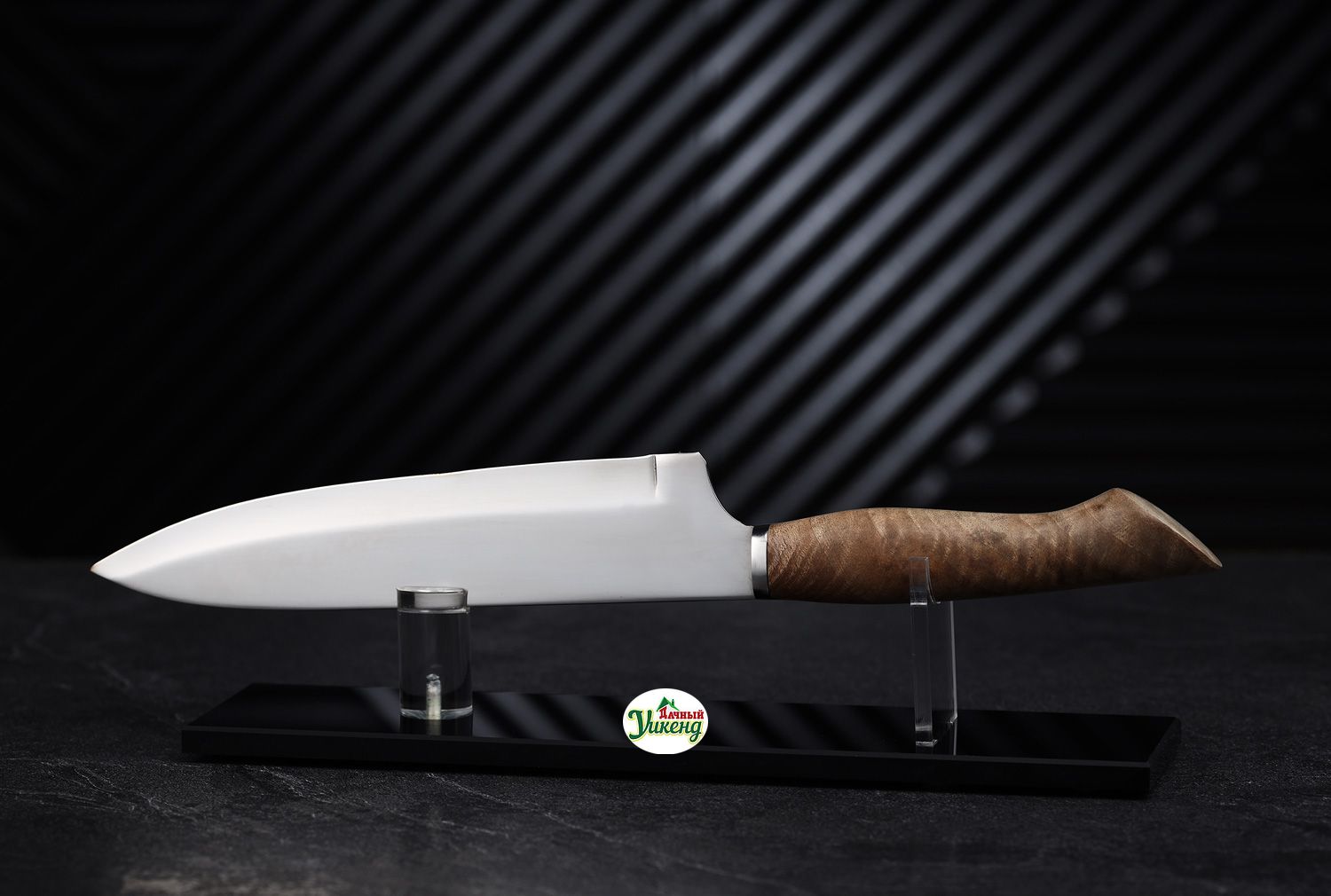 Клинок из стали Х12МФ обладает высокой твёрдостью и долговечностью, а деревянная рукоятка обеспечивает комфортный хват.