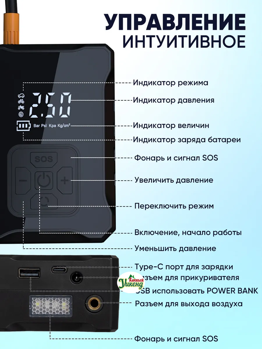 Встроенный в насос повербанк поможет зарядить телфон в дороге в случае необходимости.