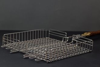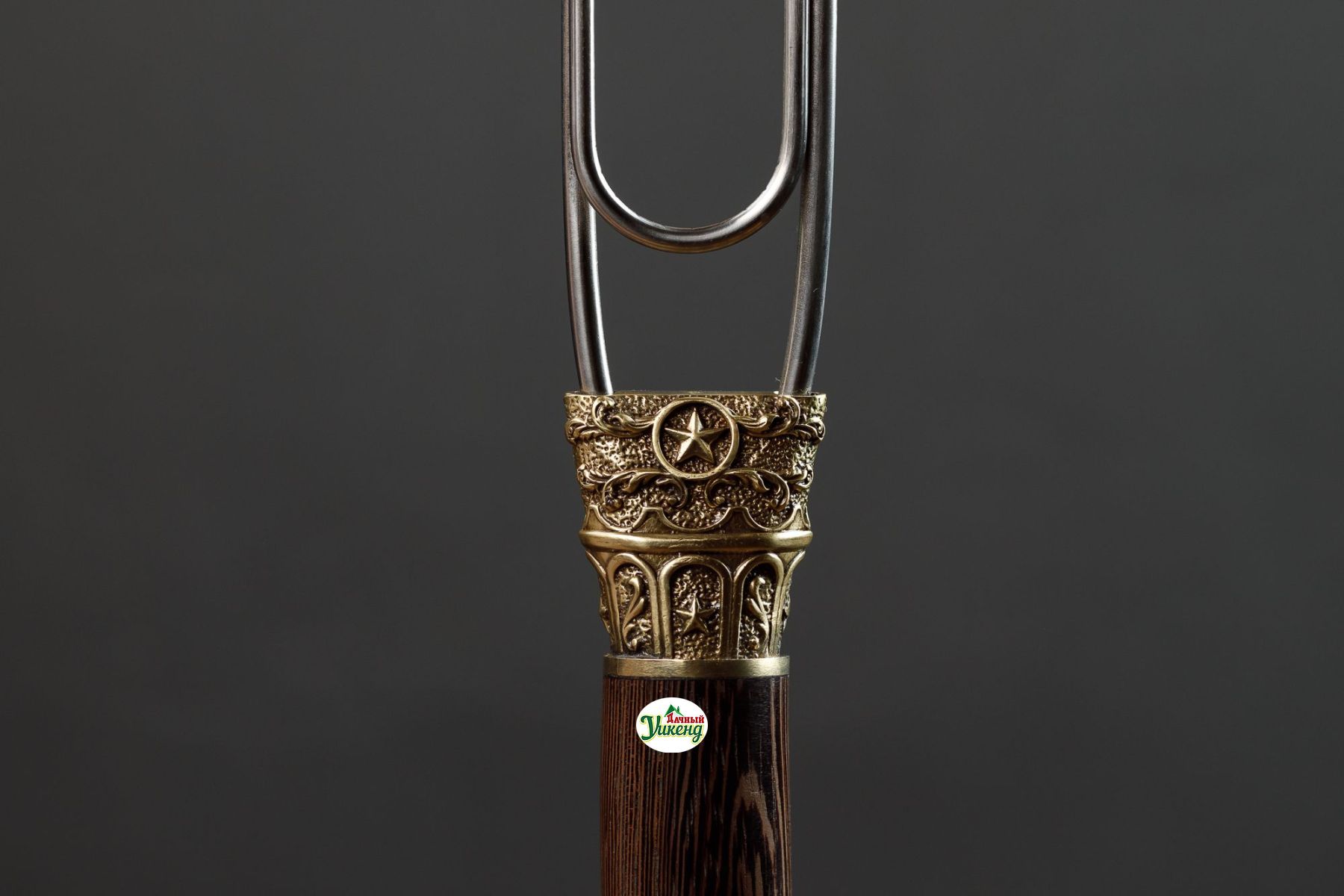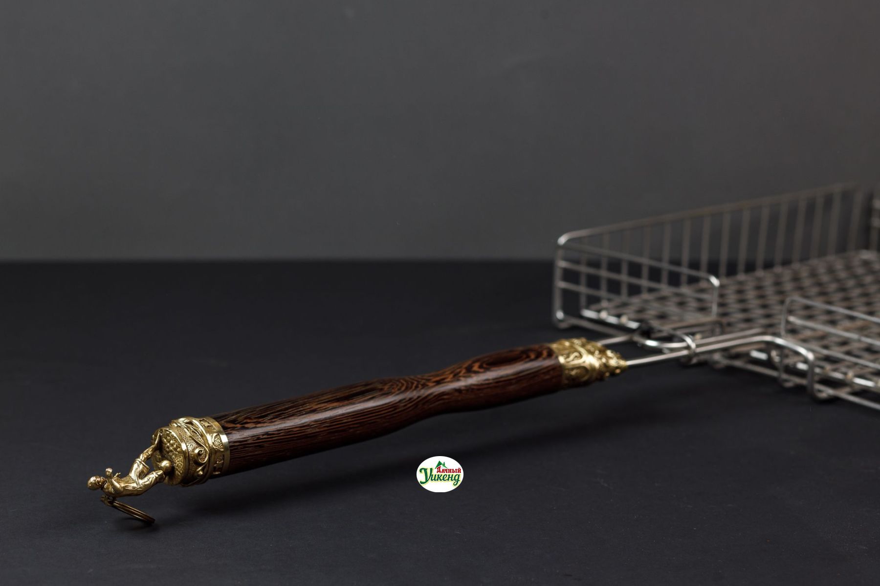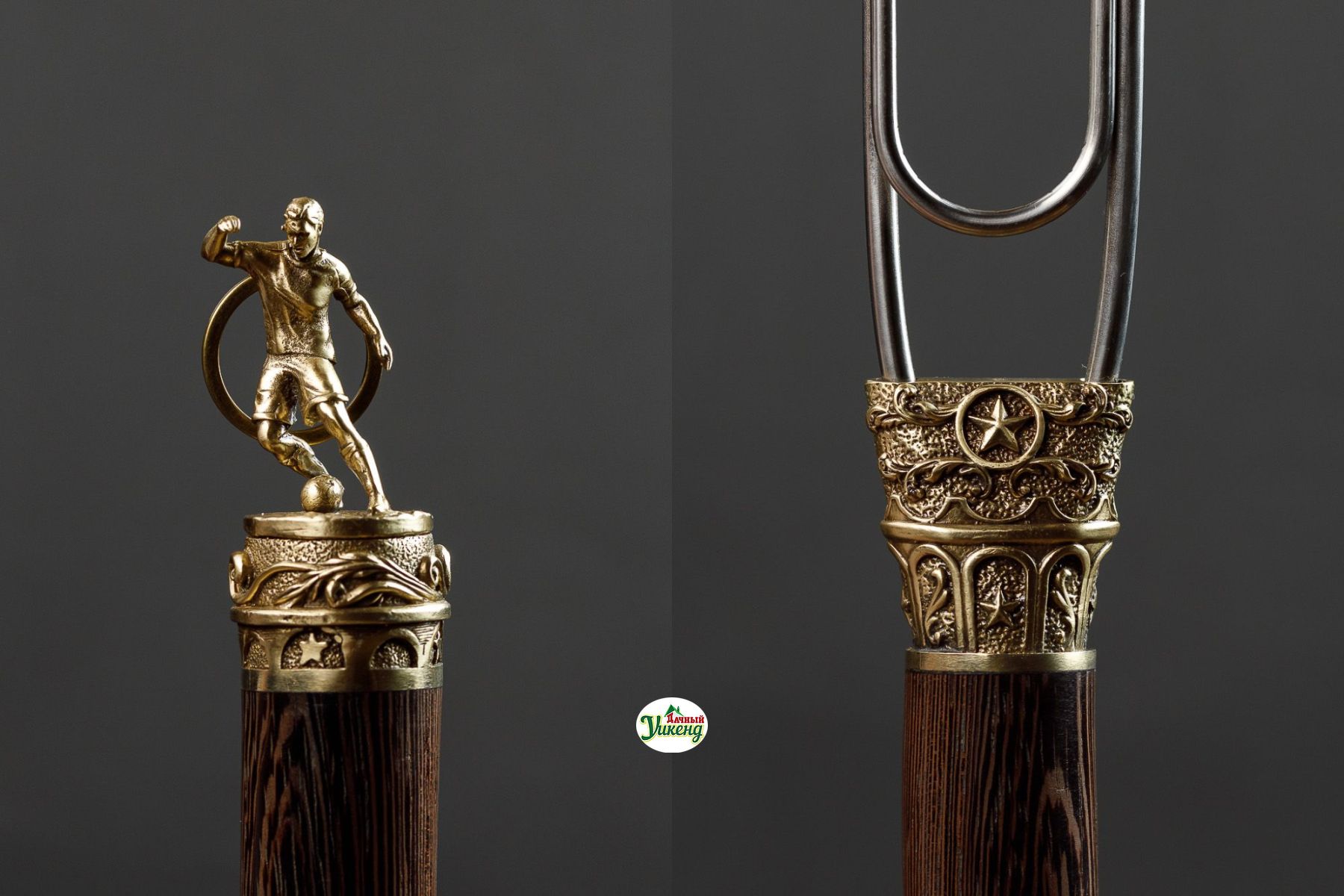 Решетка-гриль с рукояткой из венге, дополнена бронзовым набалдашником с фигурой футболиста. Игрок в азарте готовится отразить удар мячом.