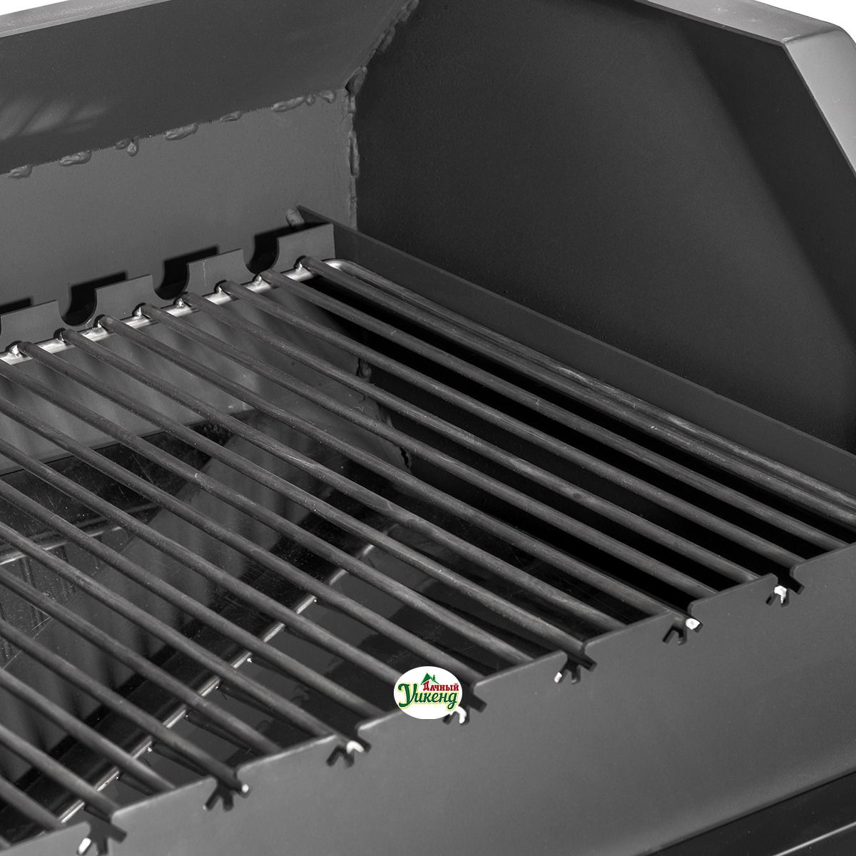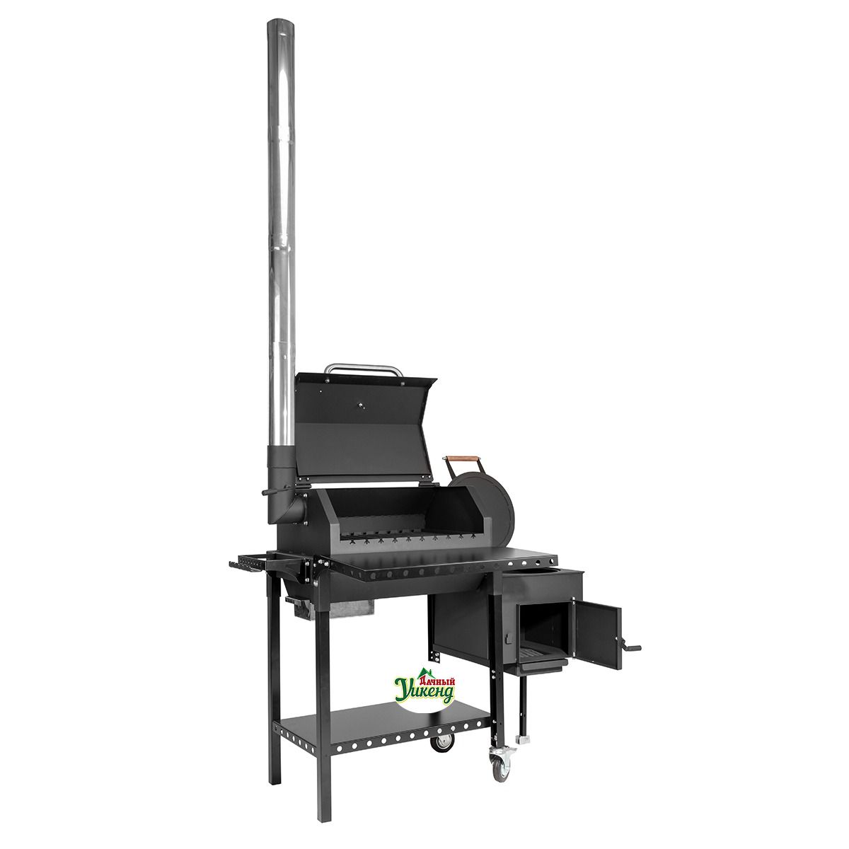 Гриль с расширенным набором опций конструктивно состоит из разборных элементов и представляет собой передвижную установку на колесах. Прямоугольная жаровня с крышкой-гриль, устанавливается на профильные ножки.