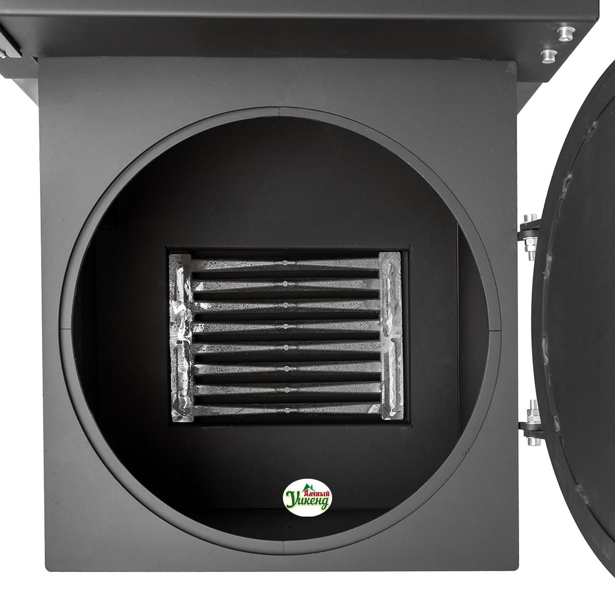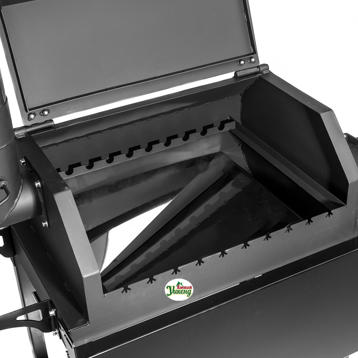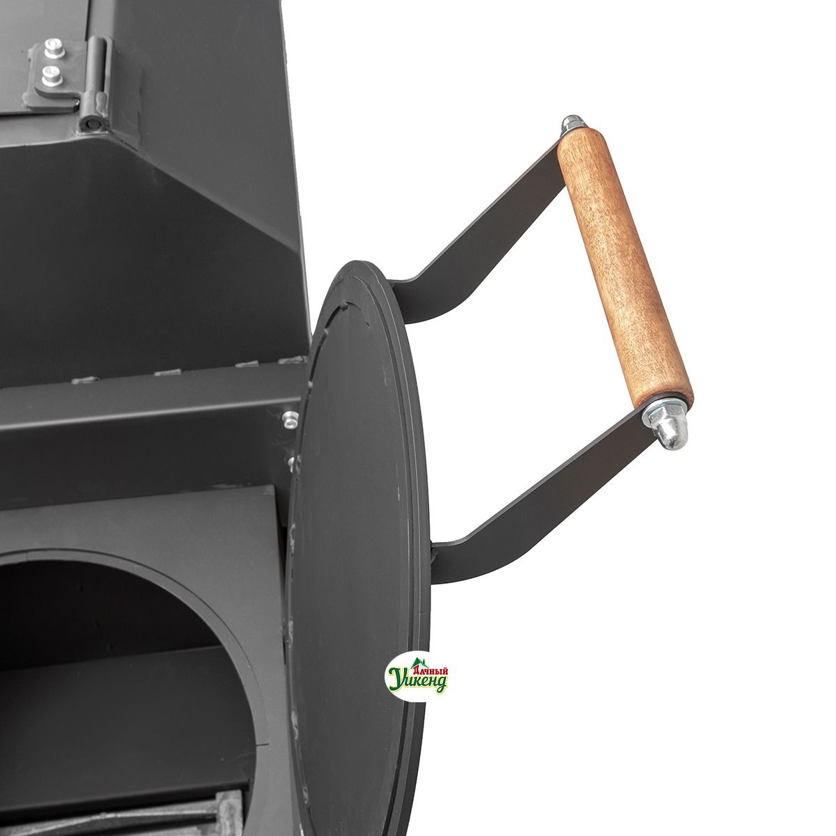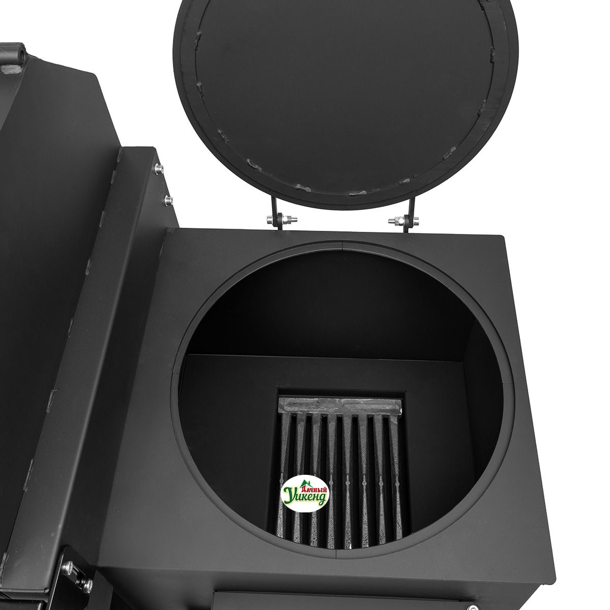 В корпусе печи имеется отверстие под казан, что позволяет использовать смокер для приготовления разнообразных блюд в казане. При ненадобности отверстие закрывается специальной крышкой. Конструкция печи оборудована колосником, зольником и дверкой.