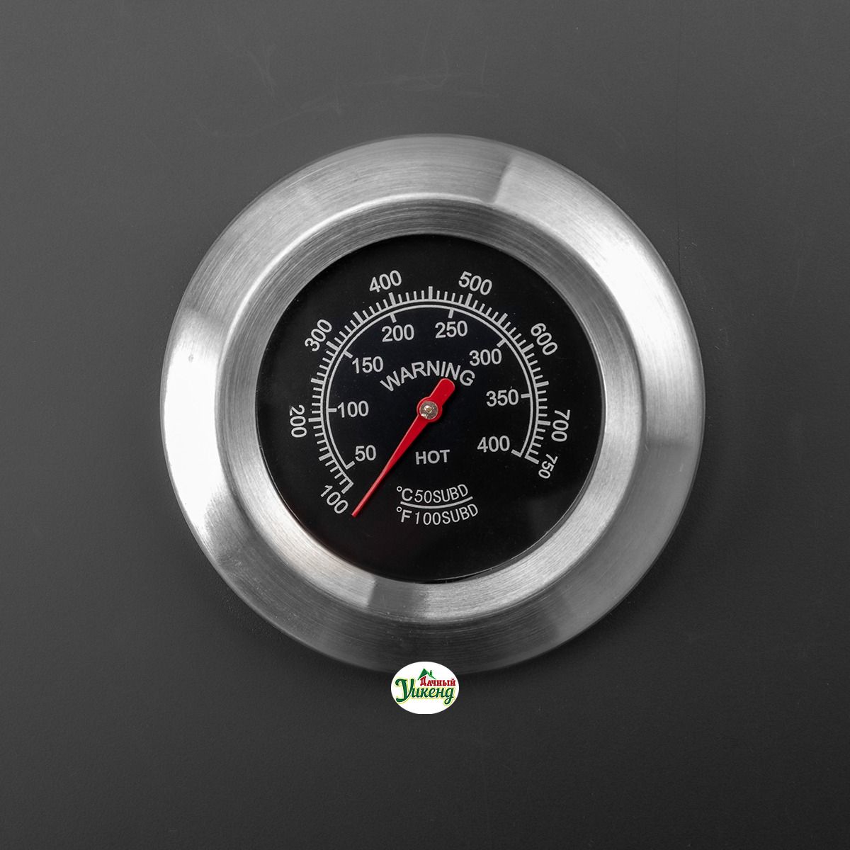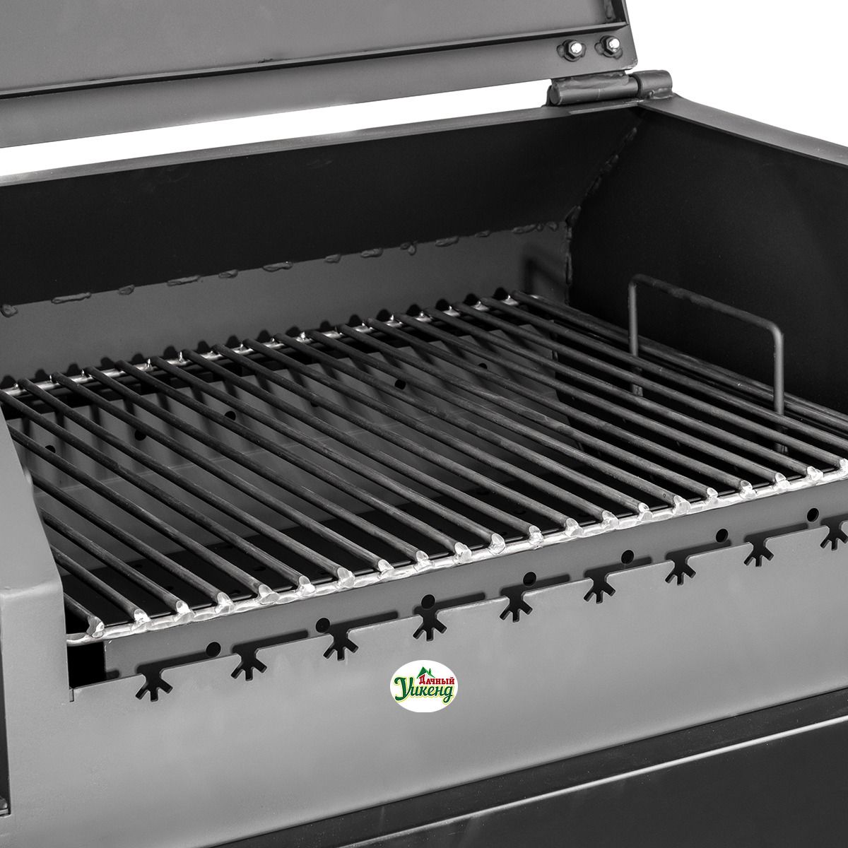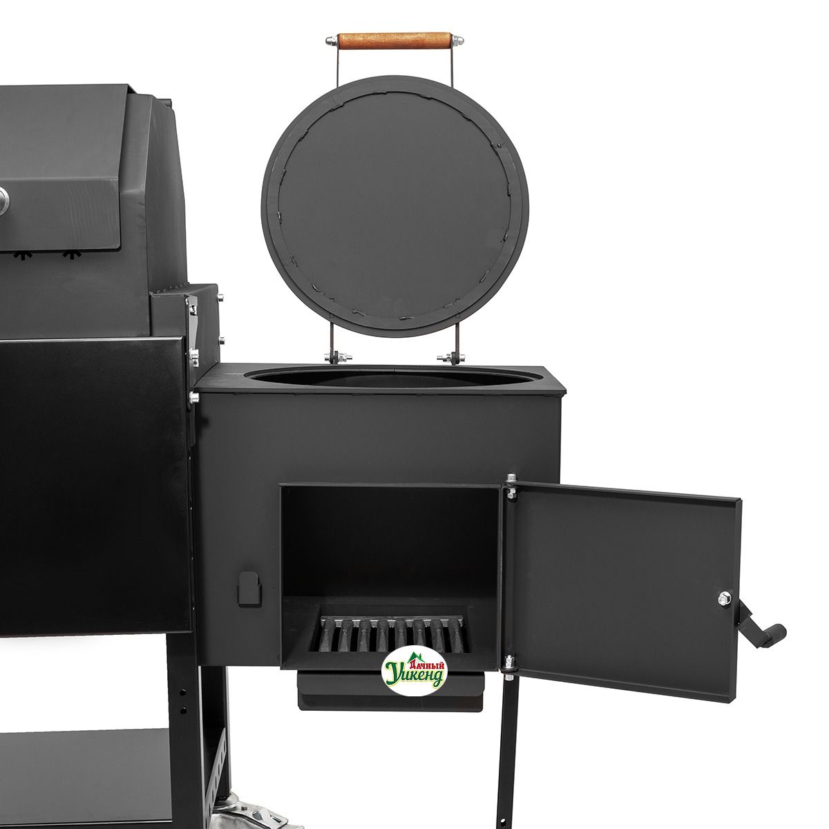Термометр на крышке жаровни помогает выставить оптимальную температуру приготовления. Печь смокер-гриля крепится с боковой стороны на опорную планку, фиксируя рабочее положение дополнительной ножкой.