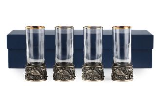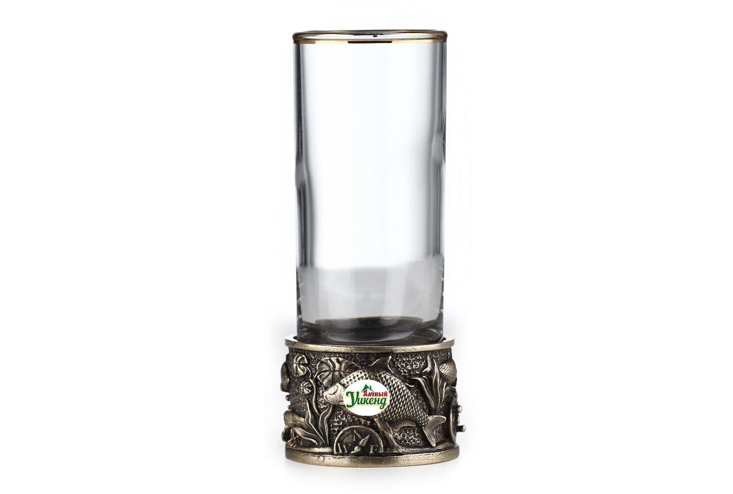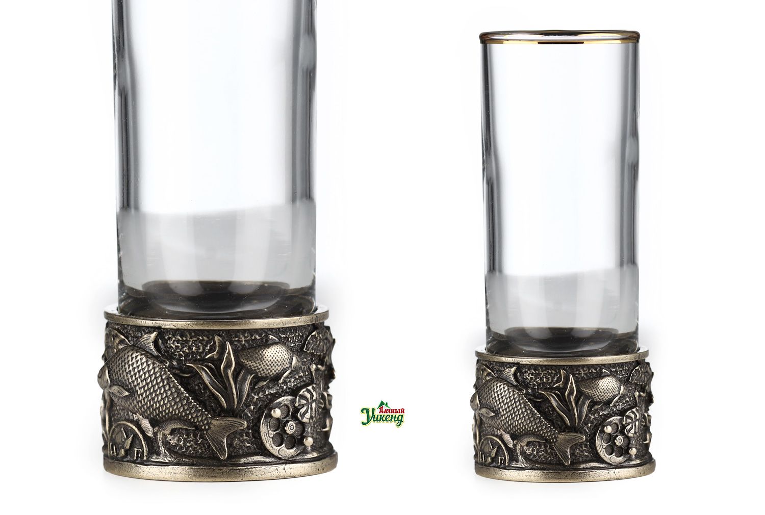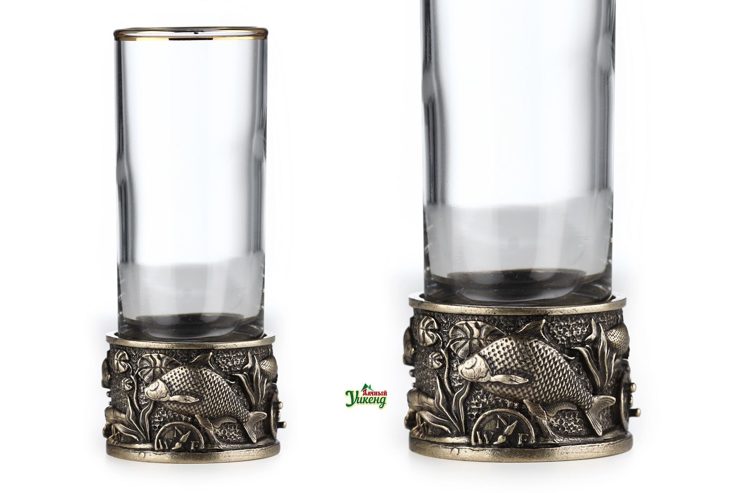 Прямая форма стопок смягчается изысканным латунным декором в виде отлитой в технике художественного литья гильзы с изображением плавающих рыбок.