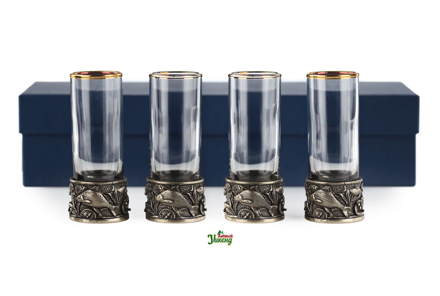 Четыре стеклянные стопки «Рыбалка» в синей дизайнерской упаковке – оригинальный подарок для любителя рыбной ловли.