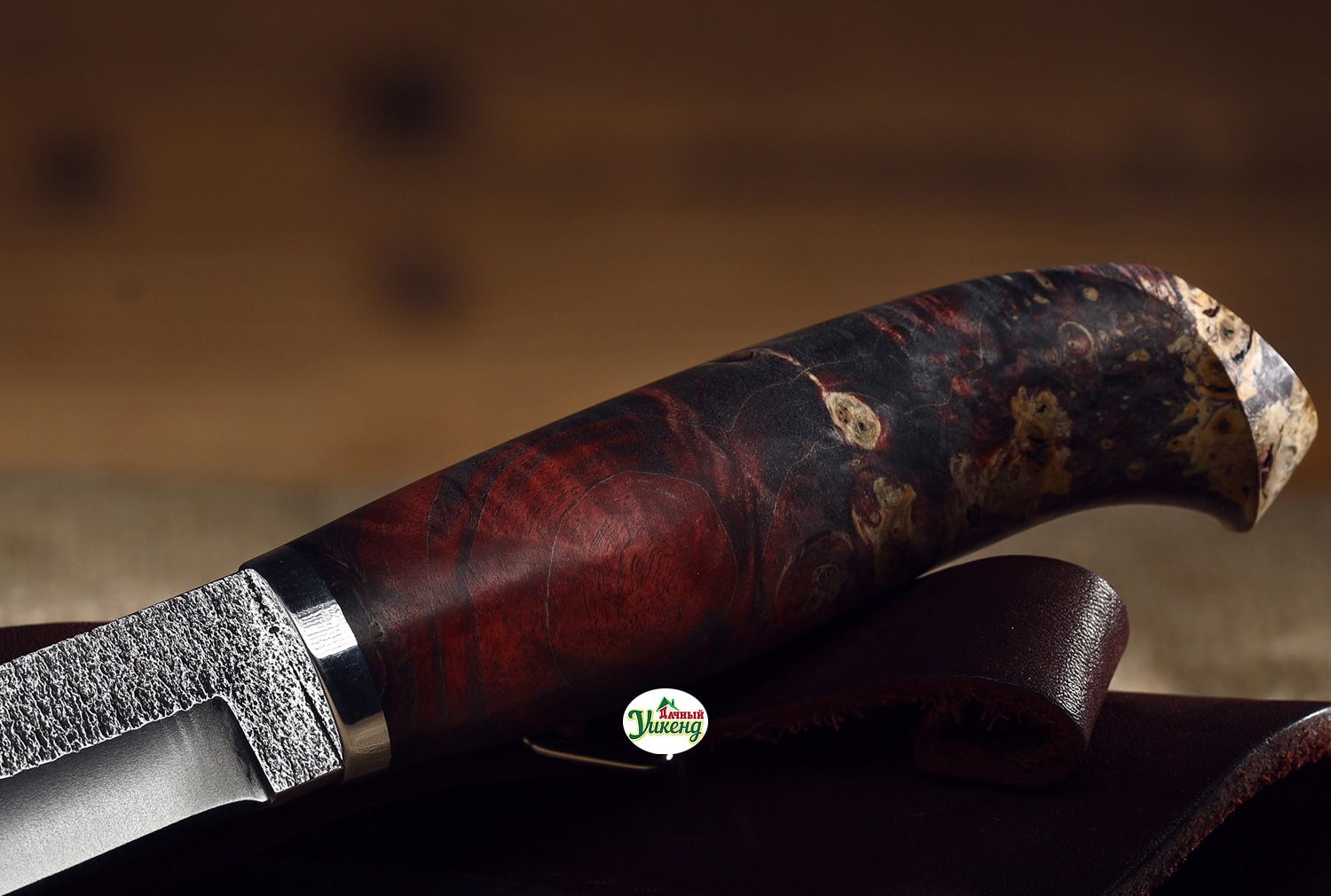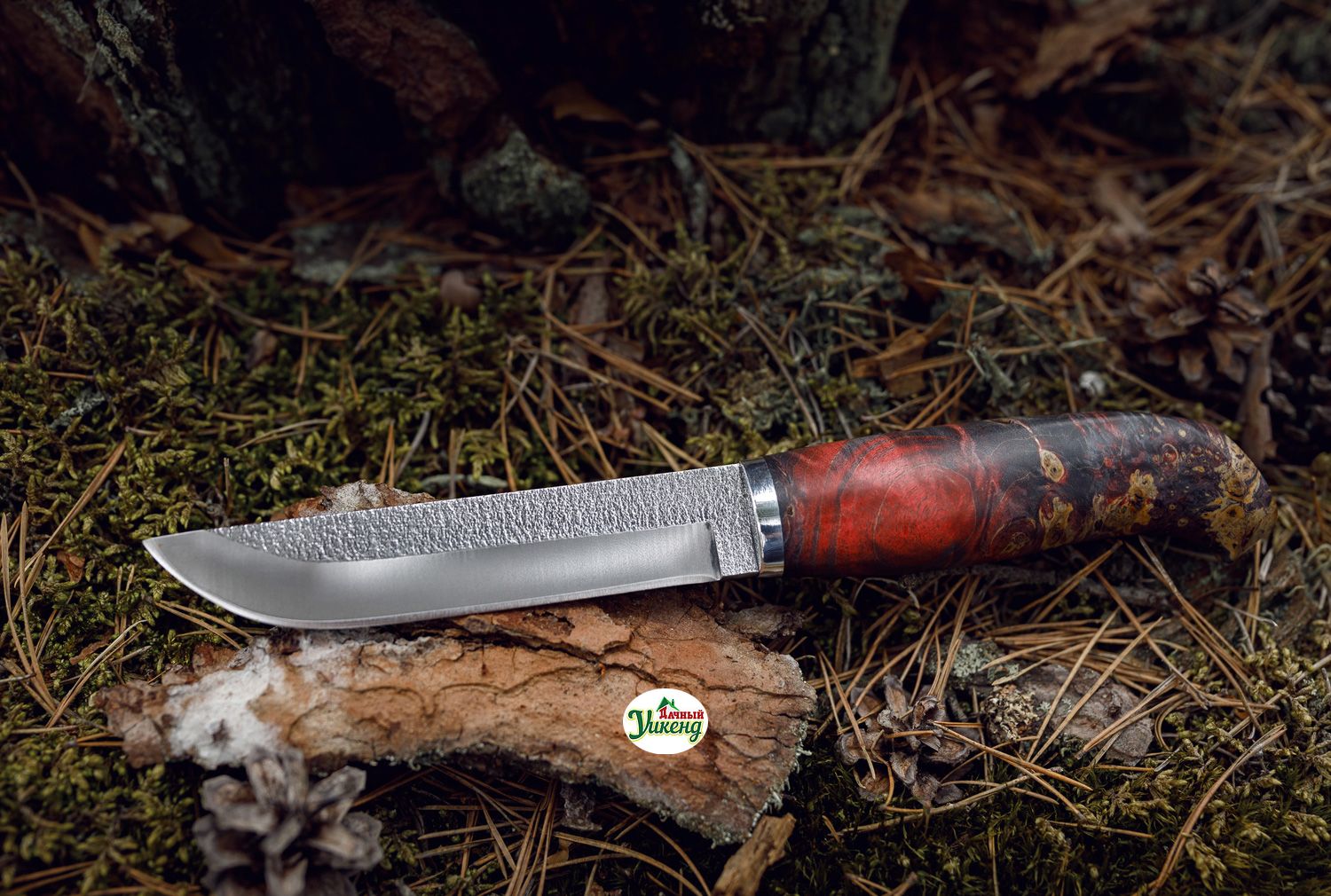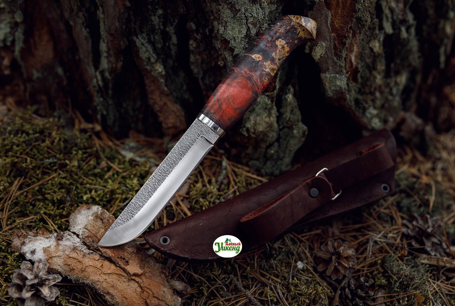 Универсальный нож «Финский» (стабилизированный голубой) с красивой деревянной рукояткой и клинком из стали Х12Мф, известной своей высокой износостойкостью и теплостойкостью.