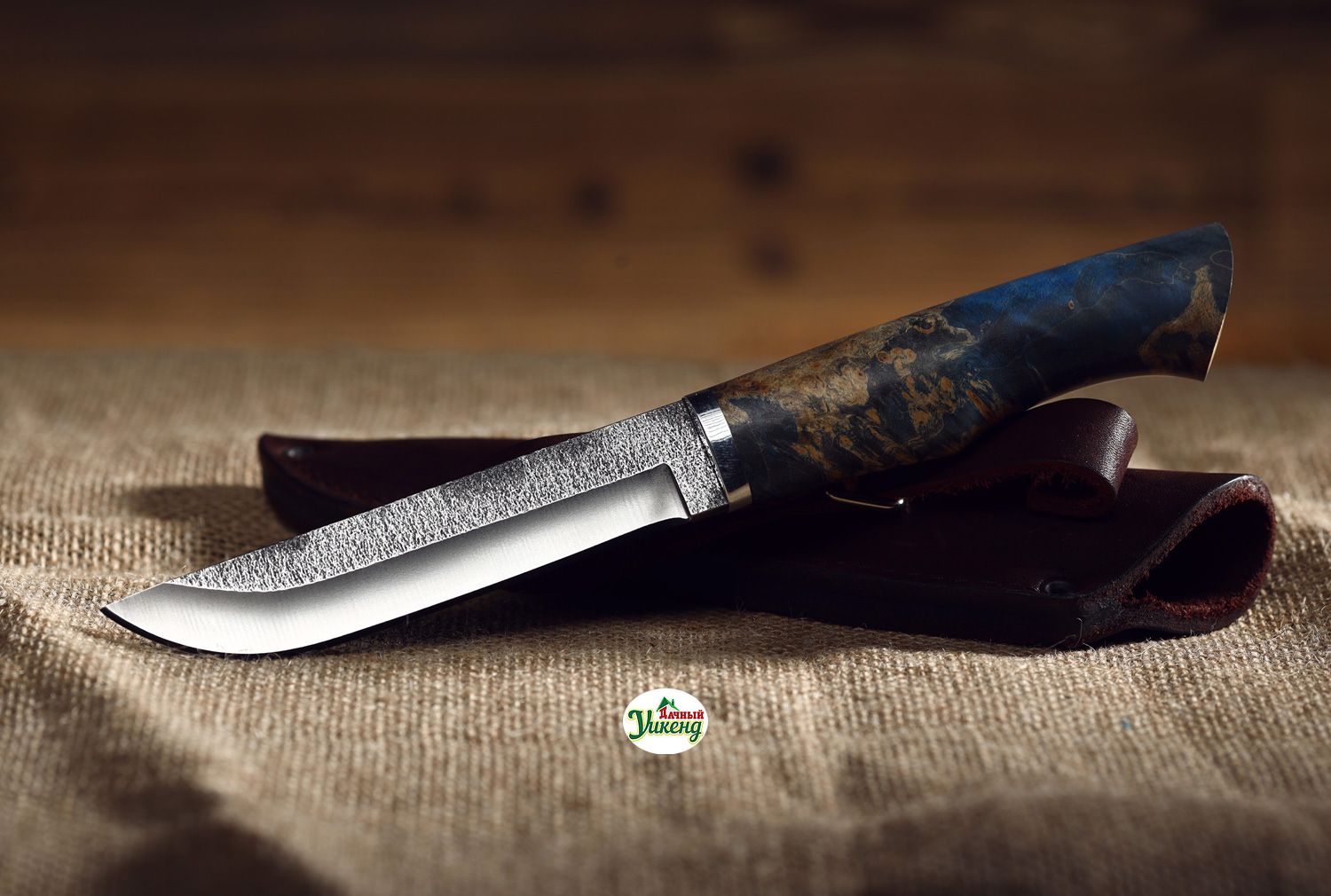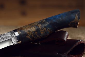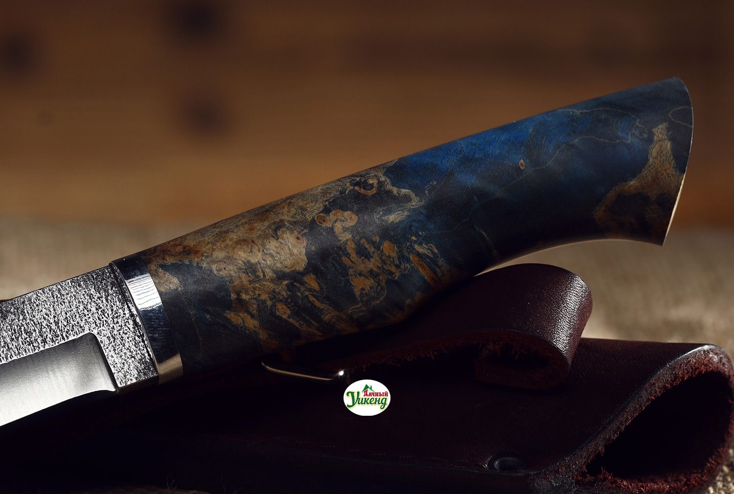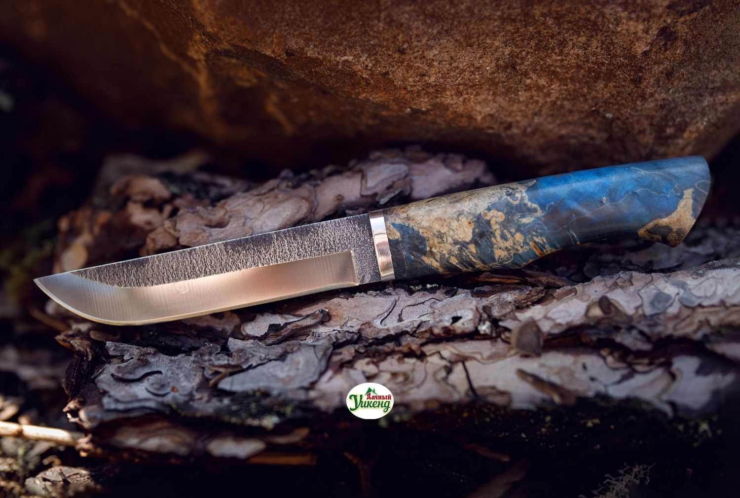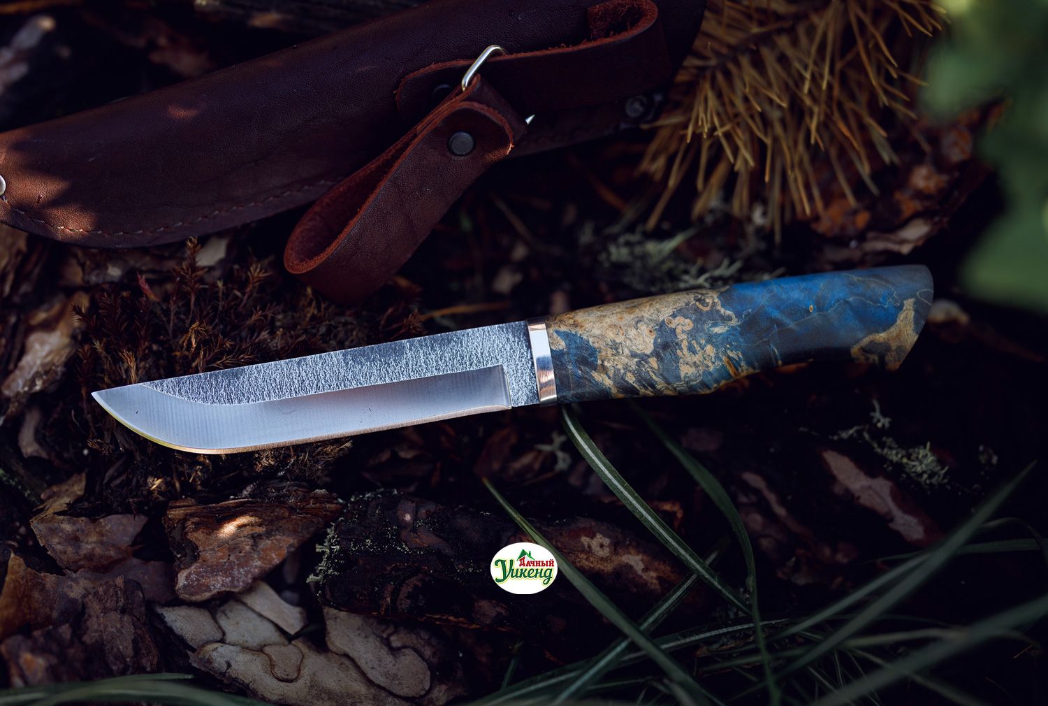 Универсальный нож «Тайга» (стабилизированный голубой) из стали Х12Мф с деревянной рукояткой сочетает прочность и эстетику.